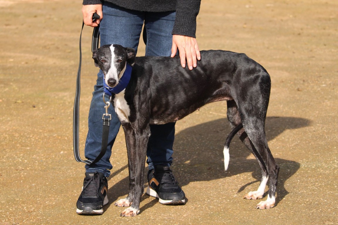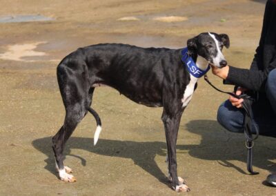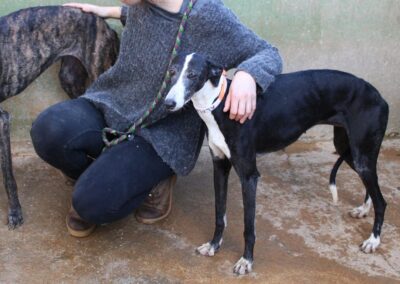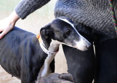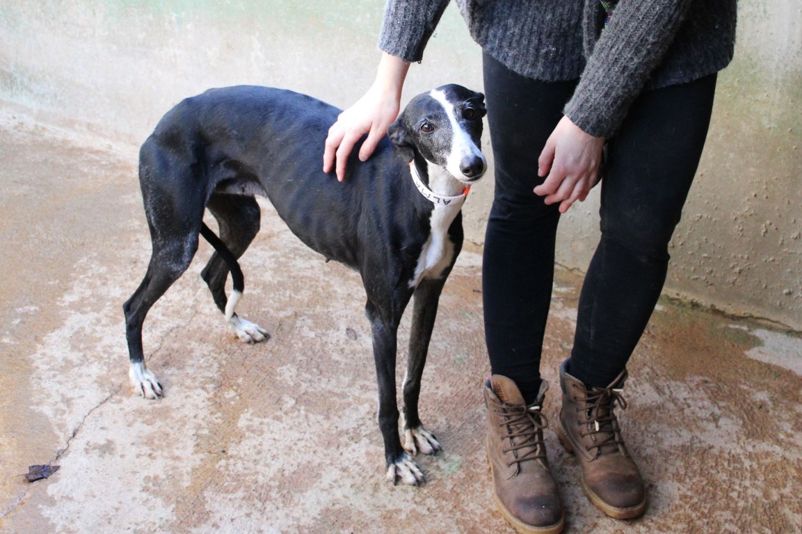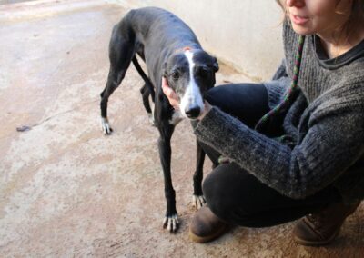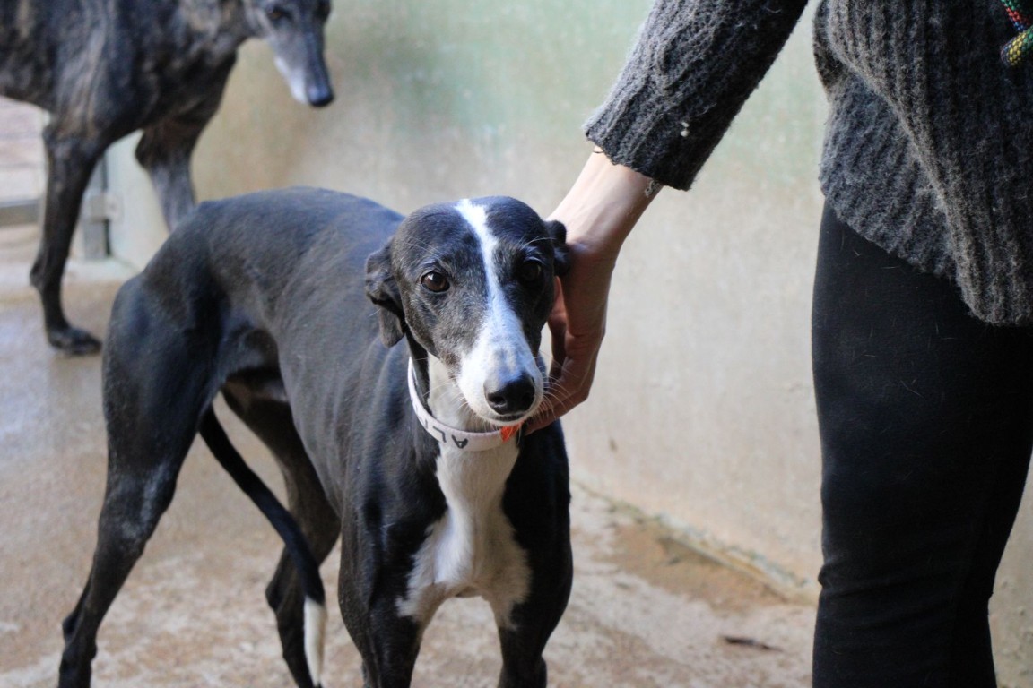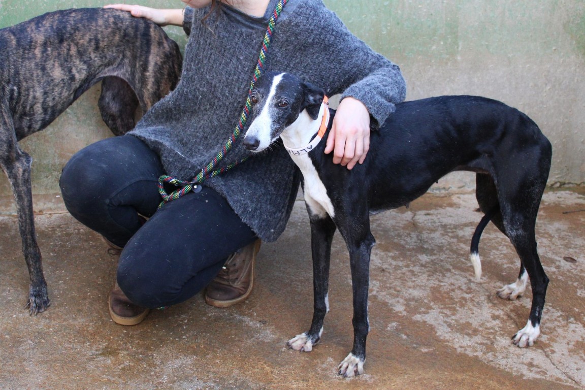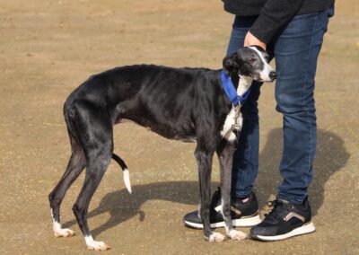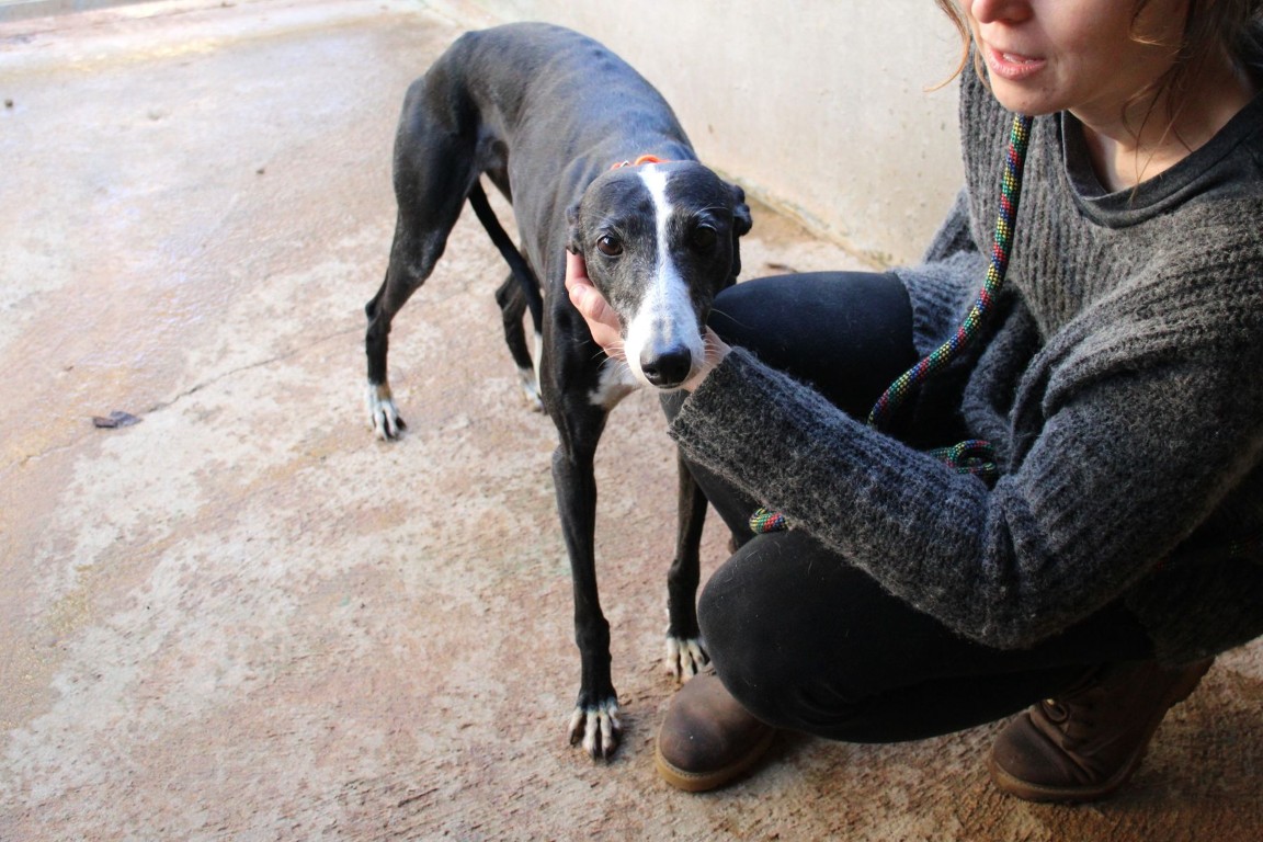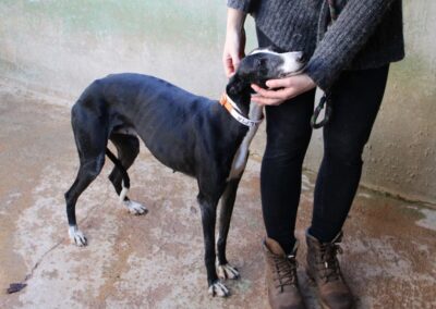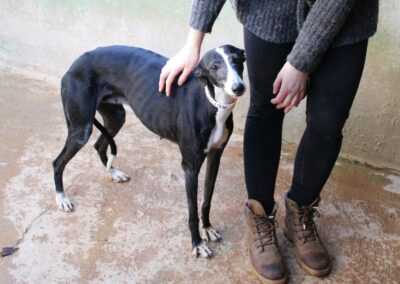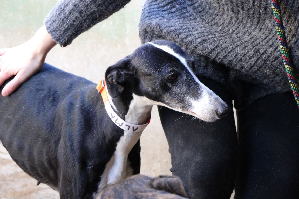 Alma est une galga noire et blanche absolument merveilleuse ✨. Une petite chienne douce et attachante, avec de magnifiques cils blancs qui illuminent son regard 🌟. Abandonnée au refuge de la FBM par un galguero, Alma n’a très certainement pas eu une vie facile…