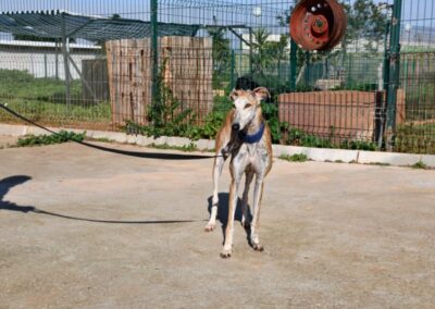 Je vous présente aujourd’hui Brita. C’est une galga adorable et enjouée qui ne manquera pas de vous apporter du bonheur au quotidien. C’est au mois de février, en fin de saison de chasse, qu’elle a été abandonnée par un galguero avec deux autres galgos. J’étais au refuge ce jour-là, et cette petite m’a beaucoup touchée. Elle était toute frêle, mais remuait la queue comme pour nous remercier de lui avoir sauvé la vie.