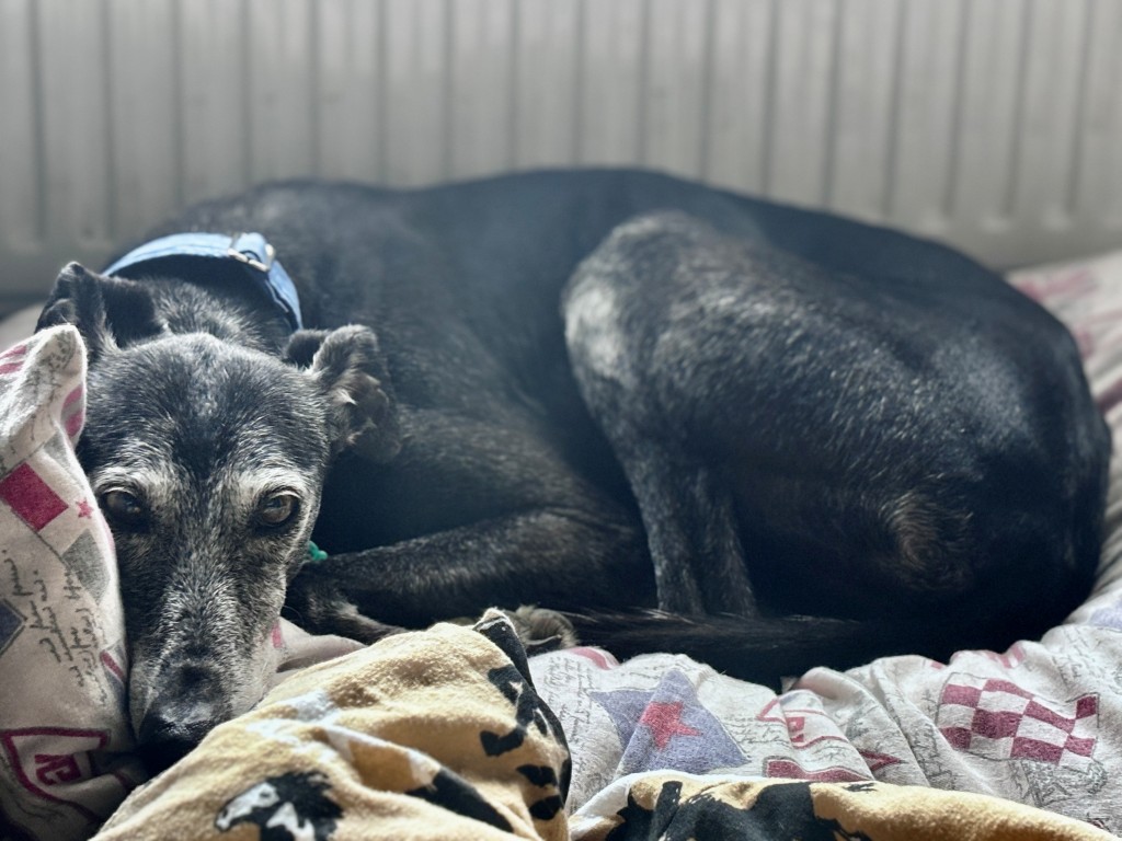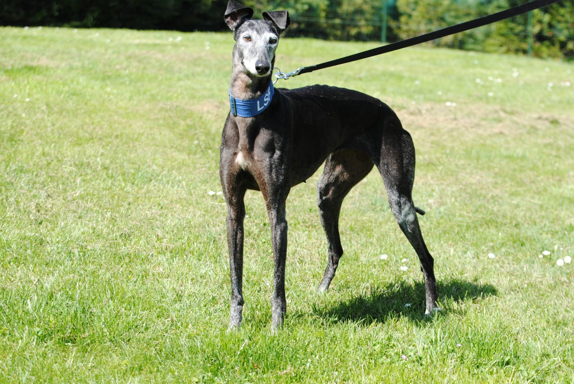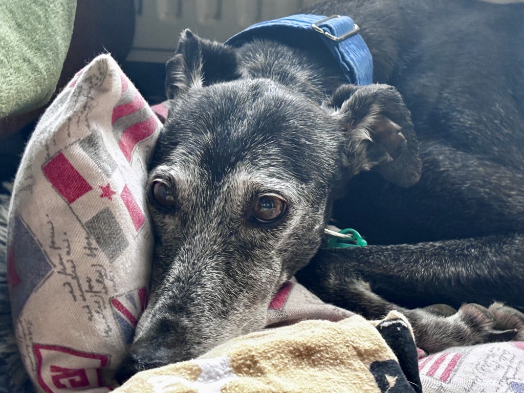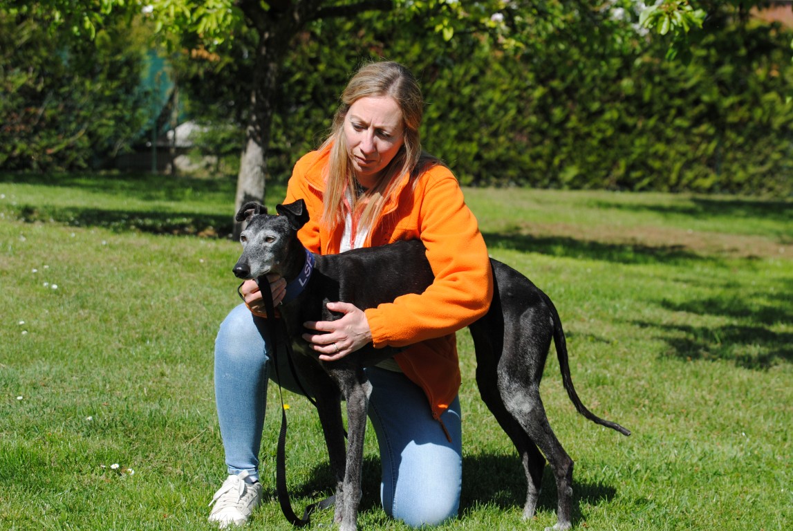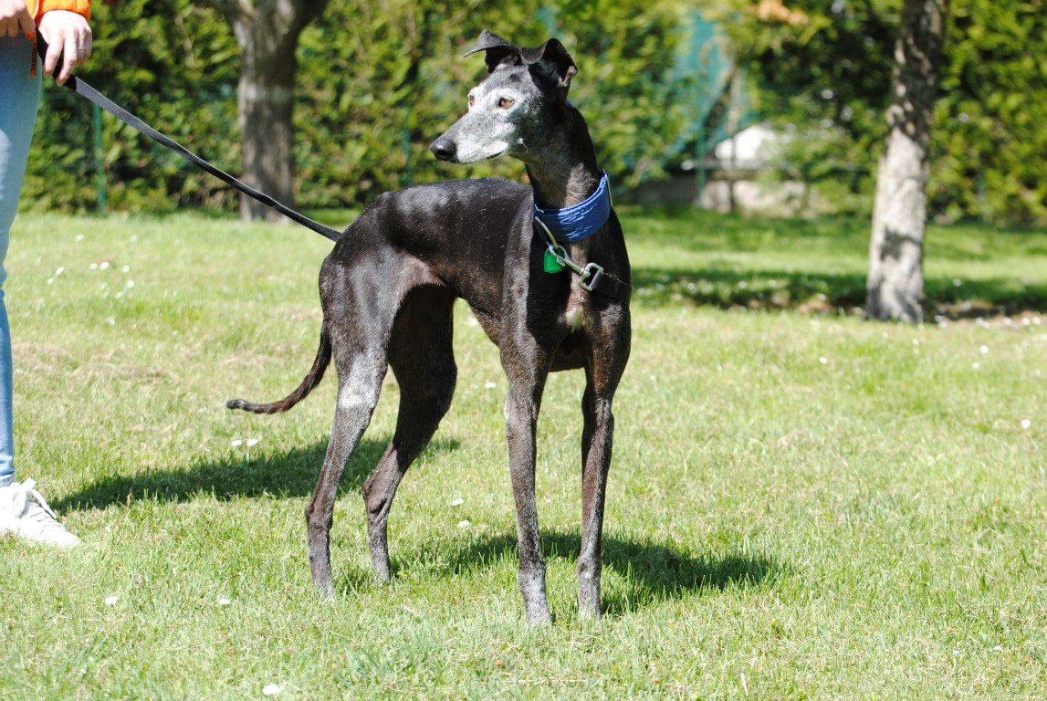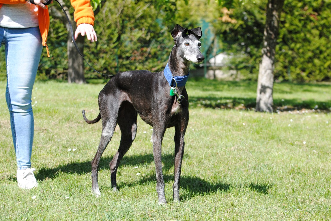 Capricho est adorable galga noire de 7 ans 💔Elle est remontée en France dans notre transport du 18 avril et est en accueil chez Sylvain, notre délégué du Nord ( 59) .