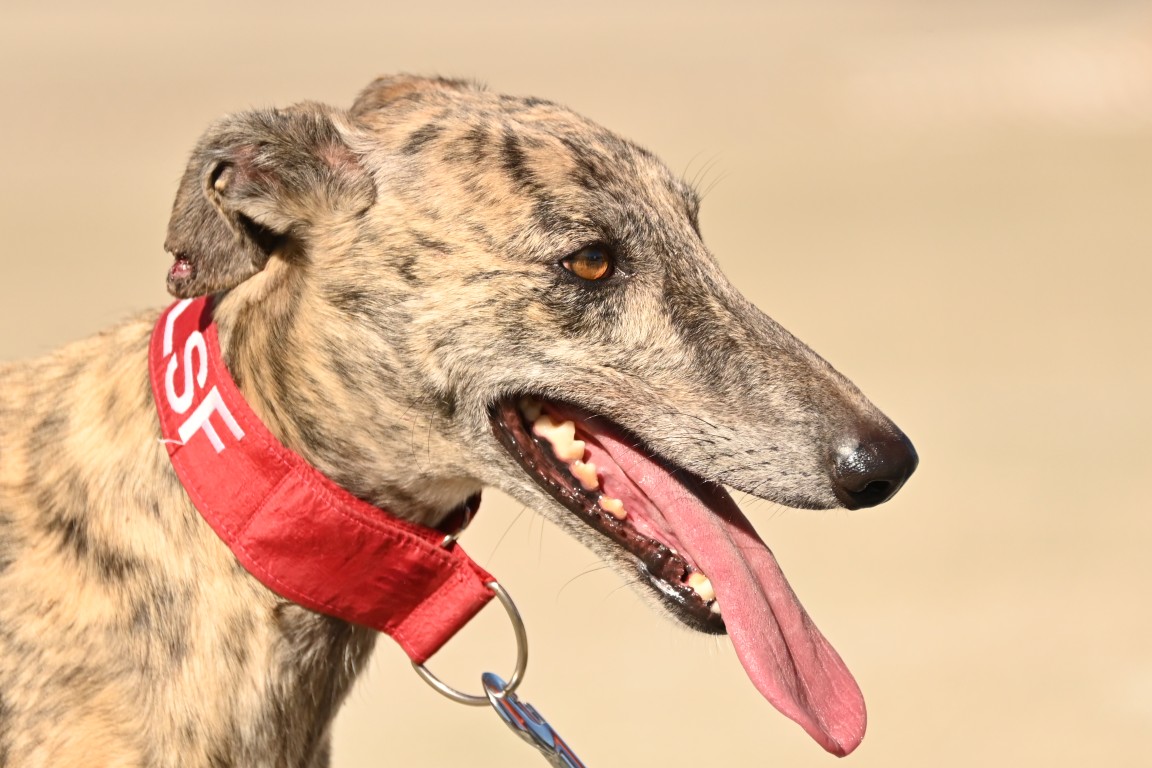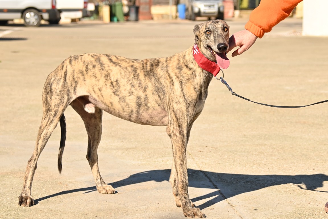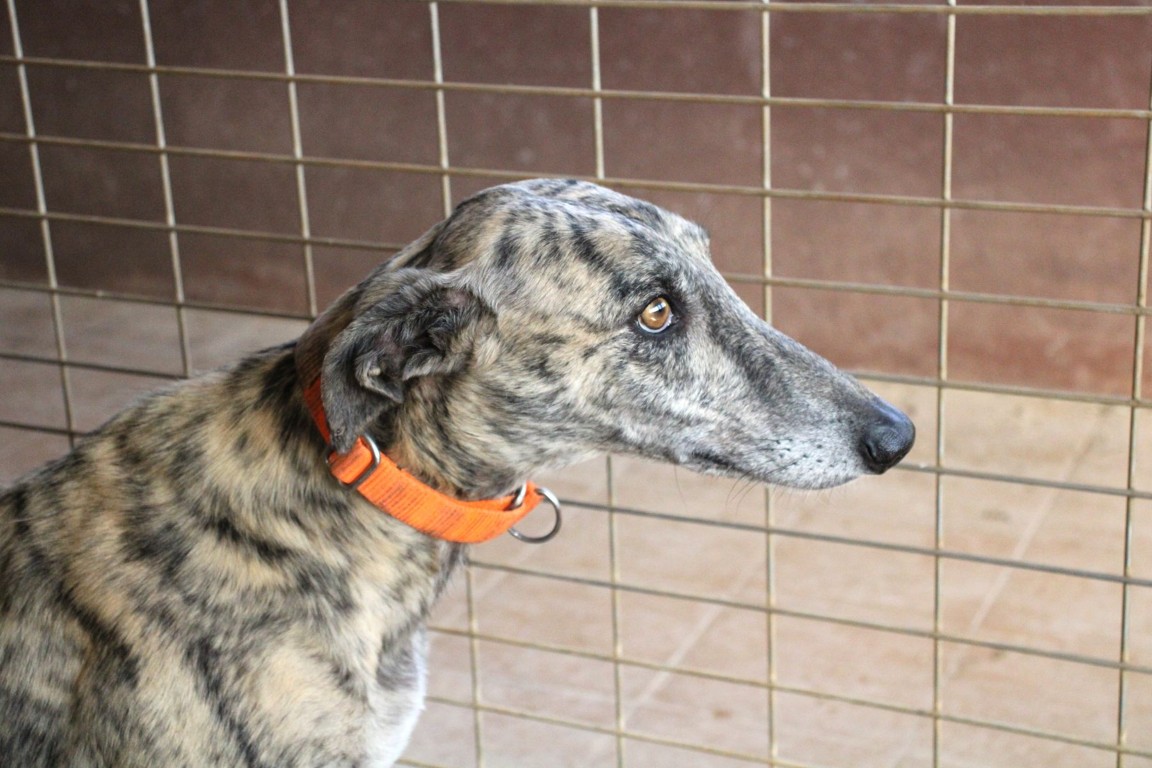 Voici Dustin, un beau galgo bringé au regard sensible 🐾