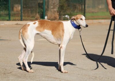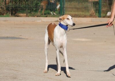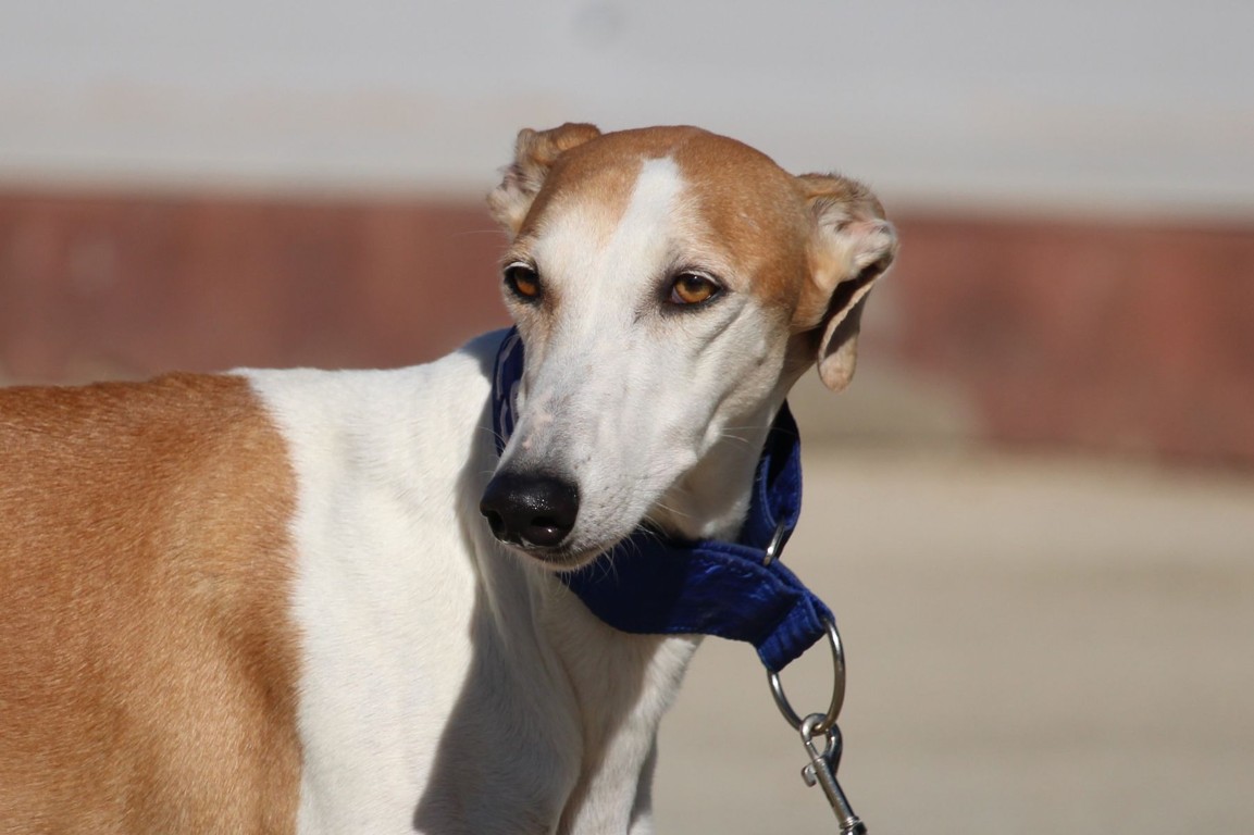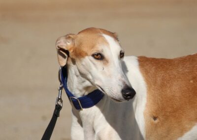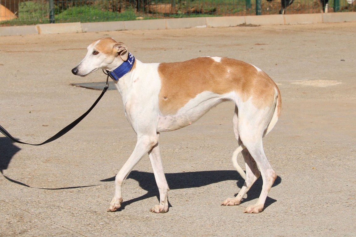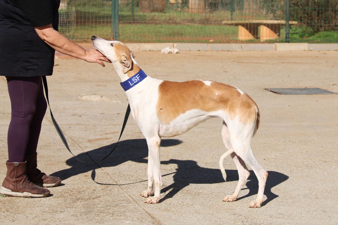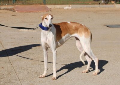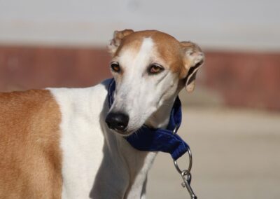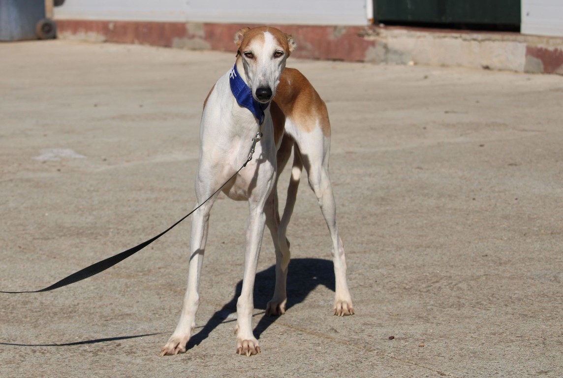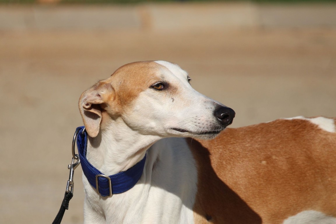 Magnifique galga blanche aux taches rousses, Enola est un véritable bijou.