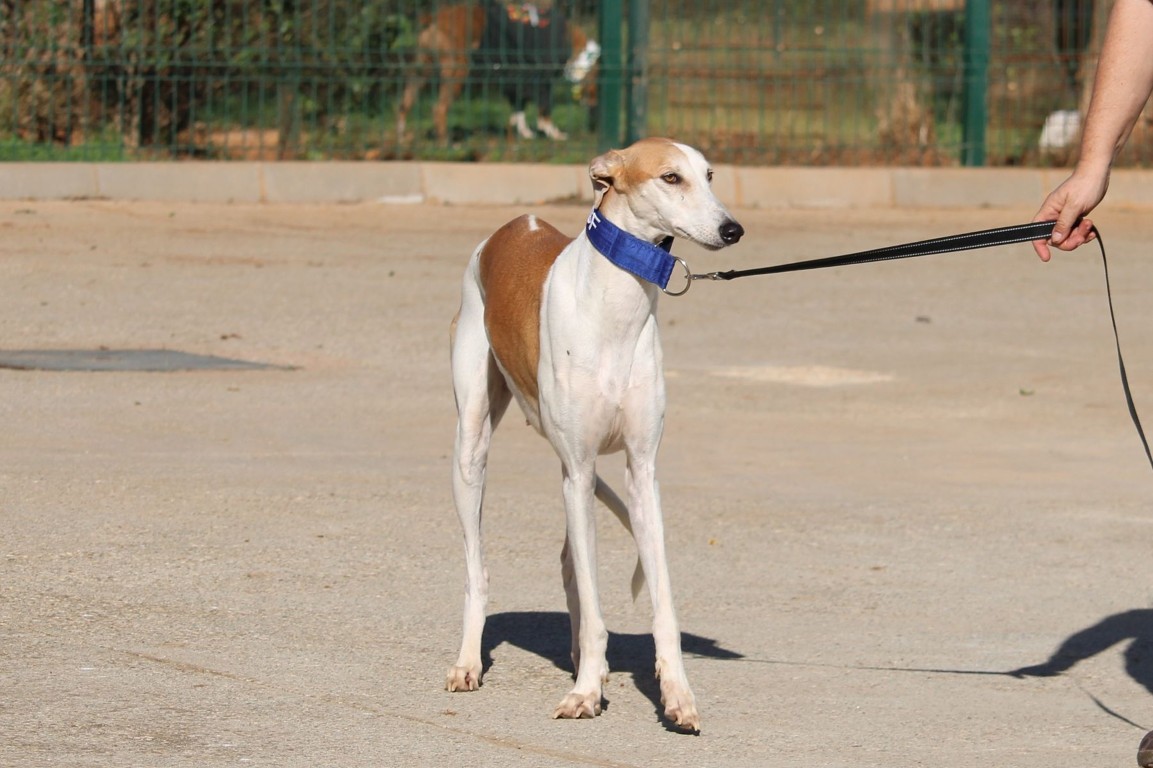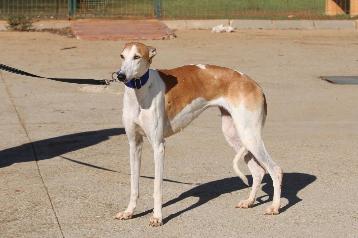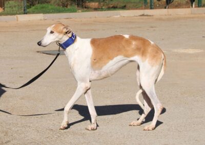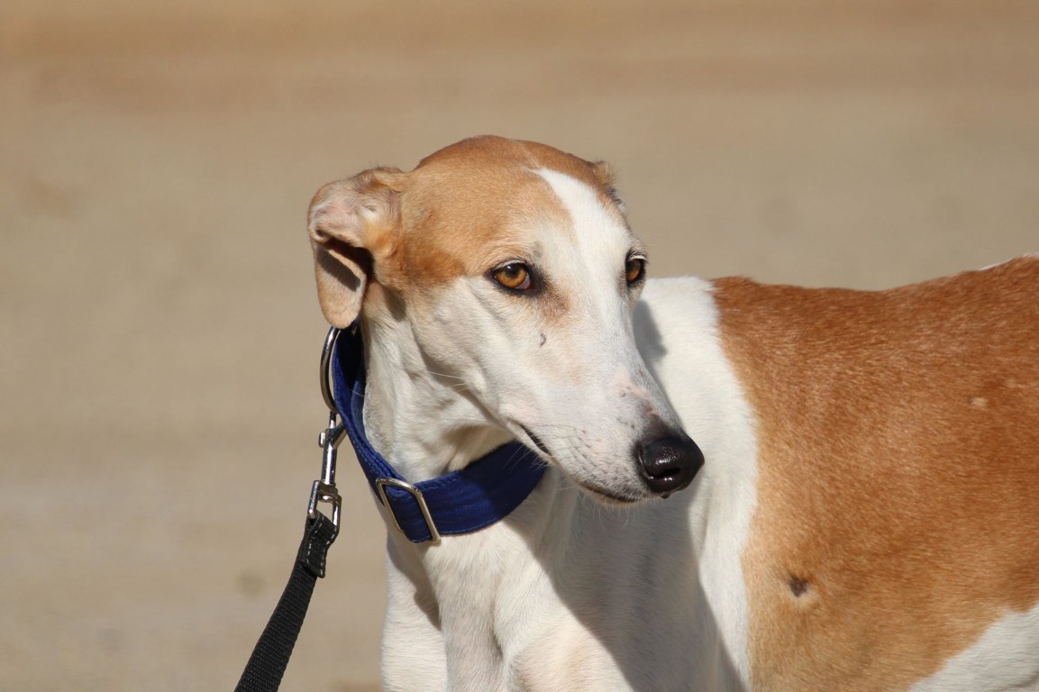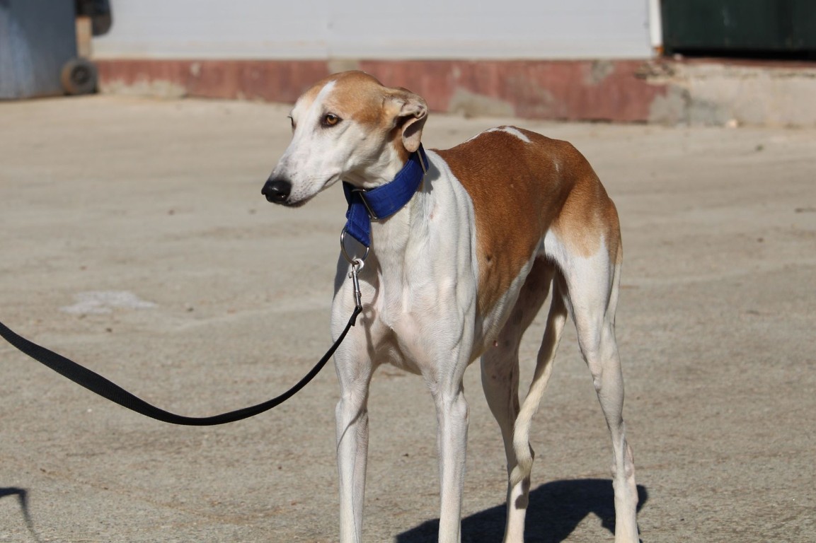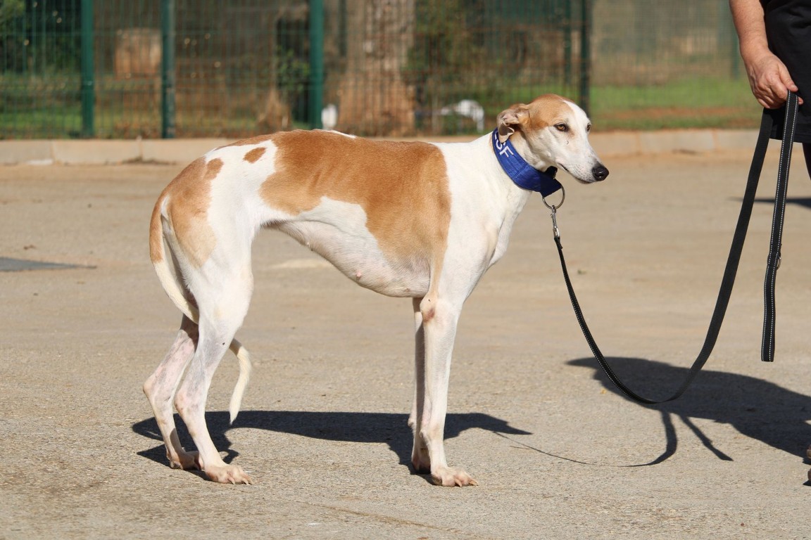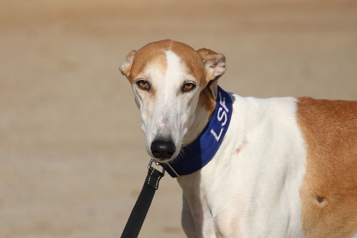 Magnifique galga blanche aux taches rousses, Enola est un véritable bijou.