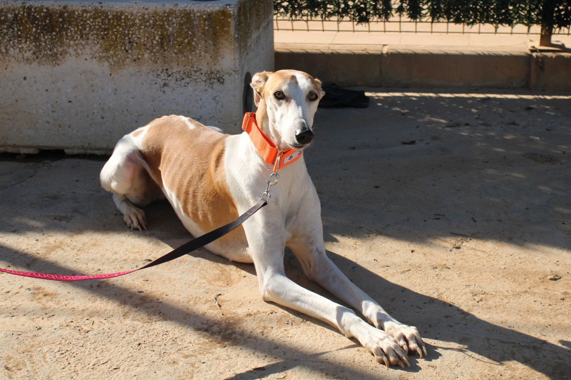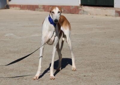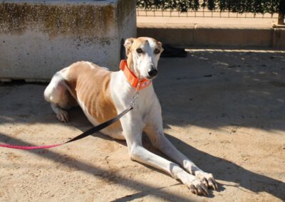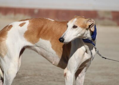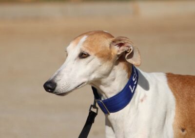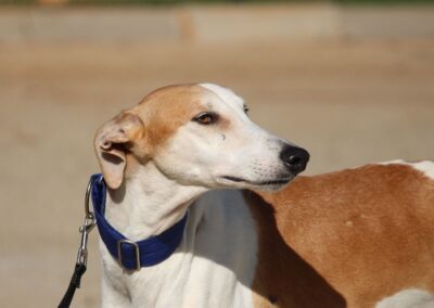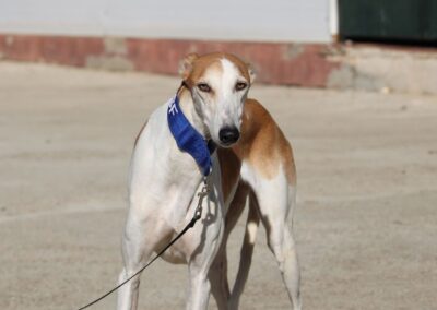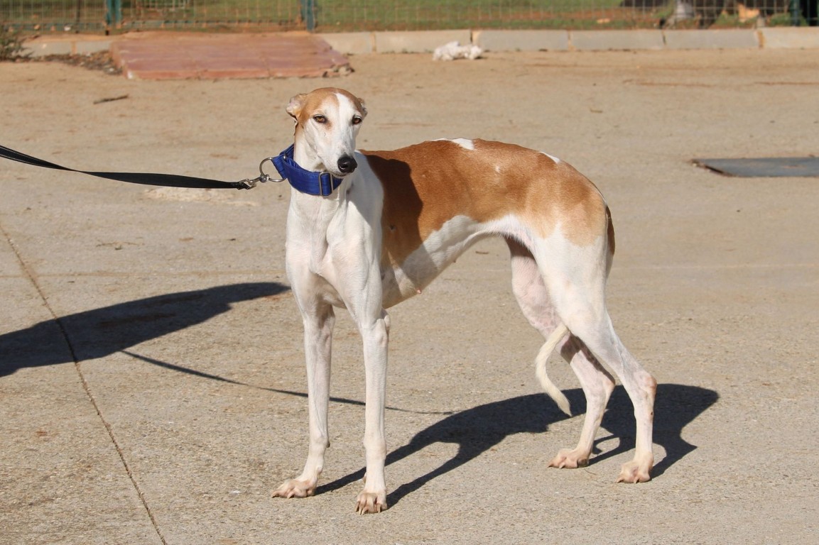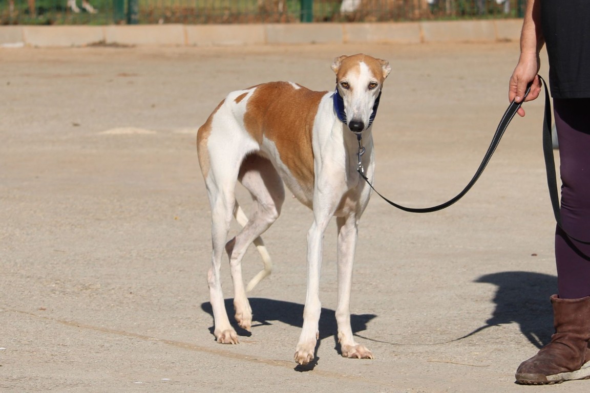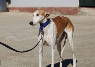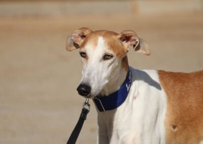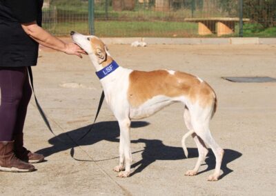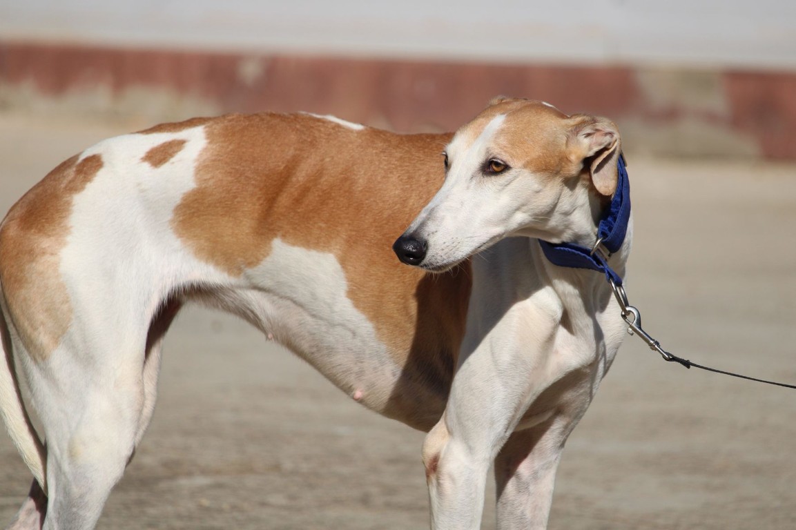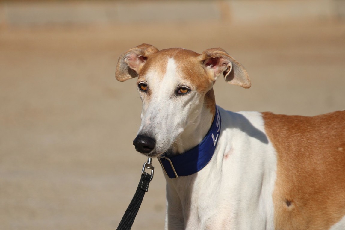 Magnifique galga blanche aux taches rousses, Enola est un véritable bijou.