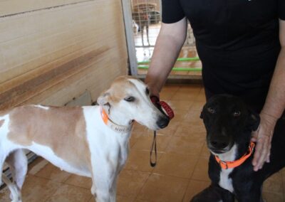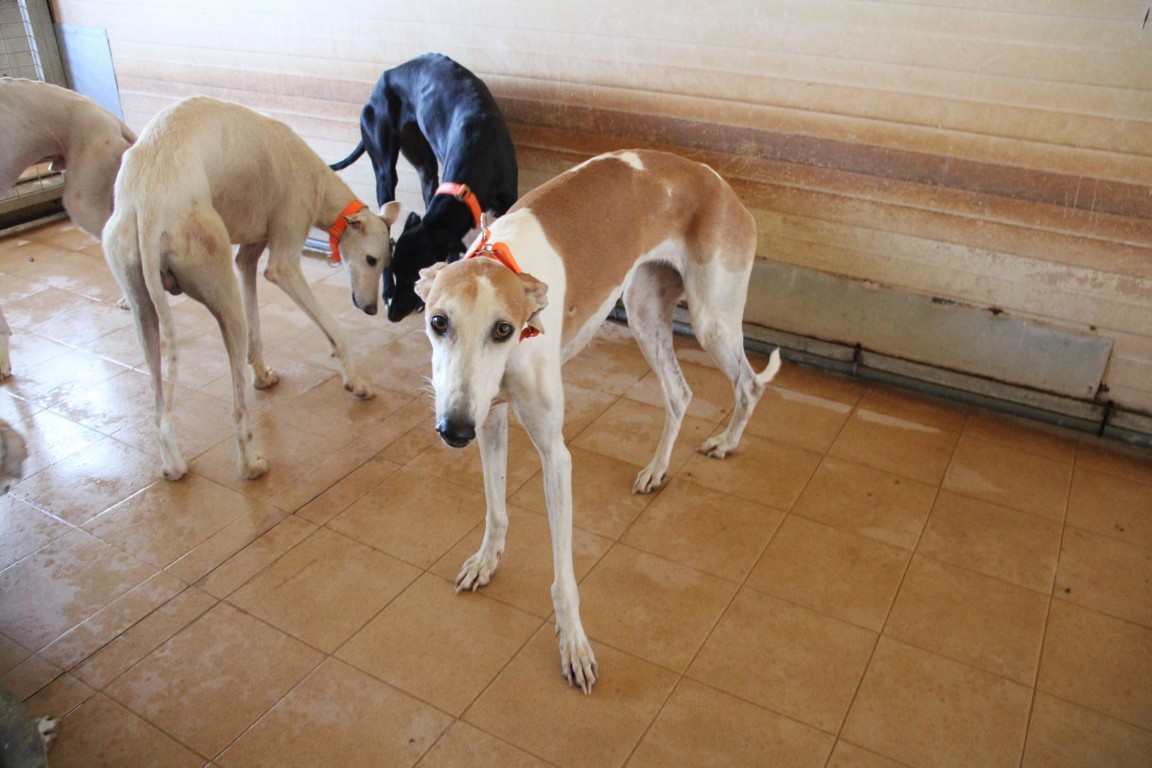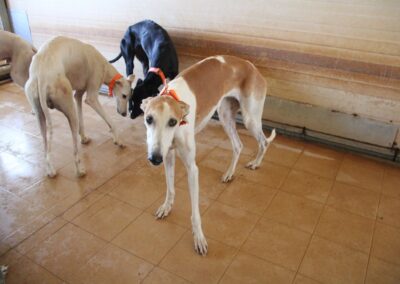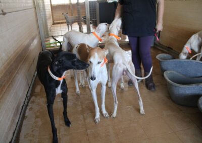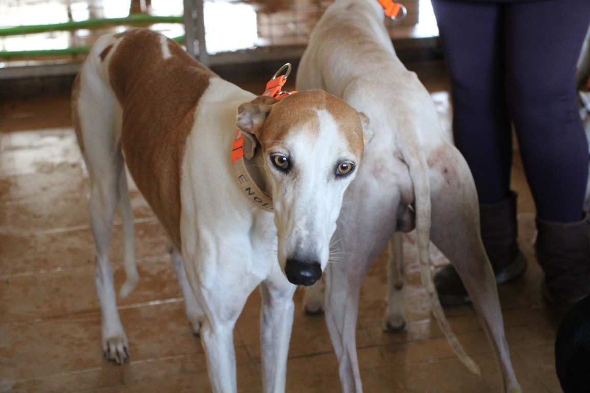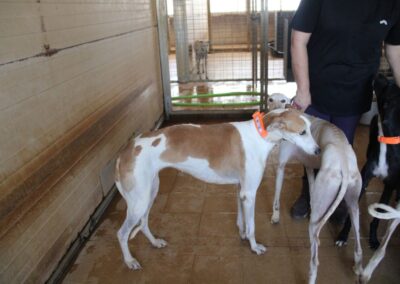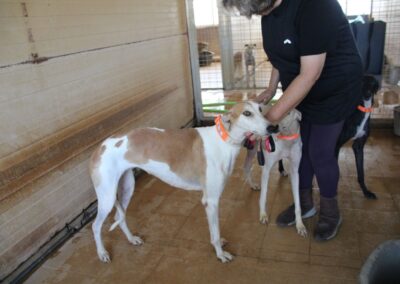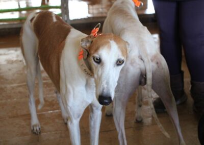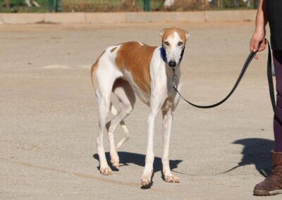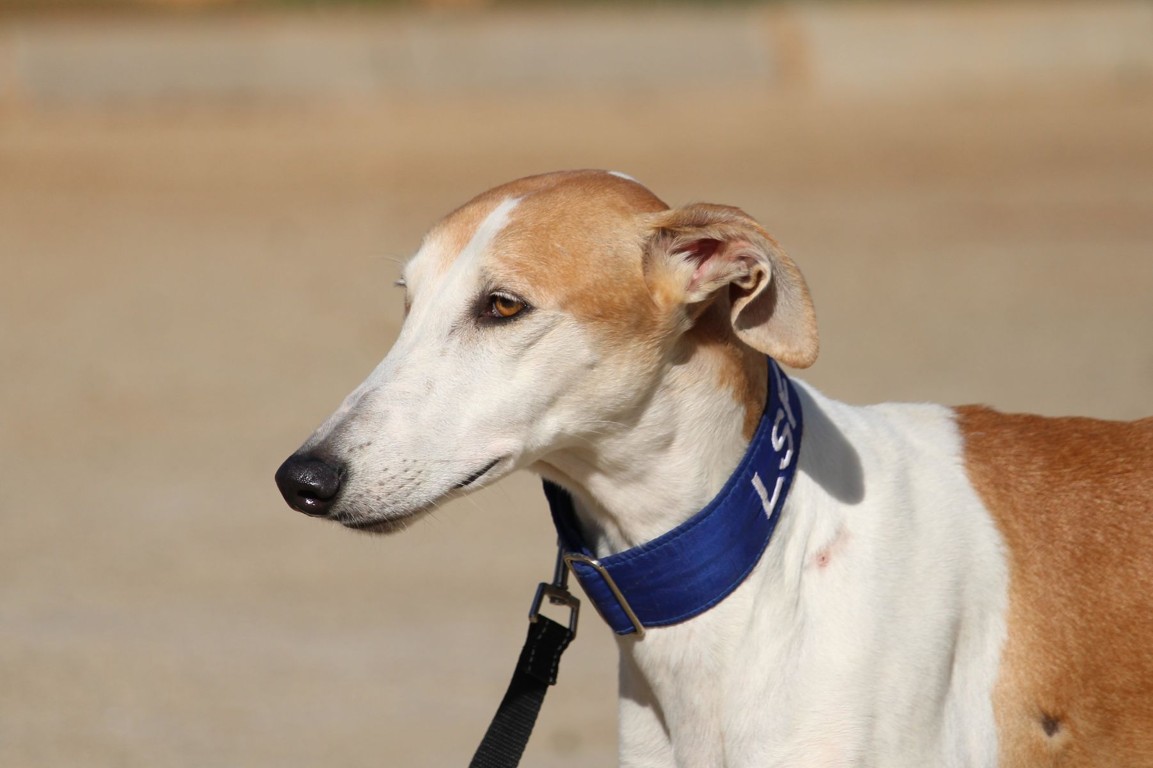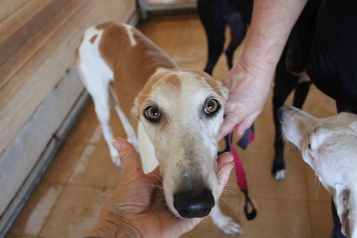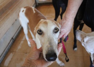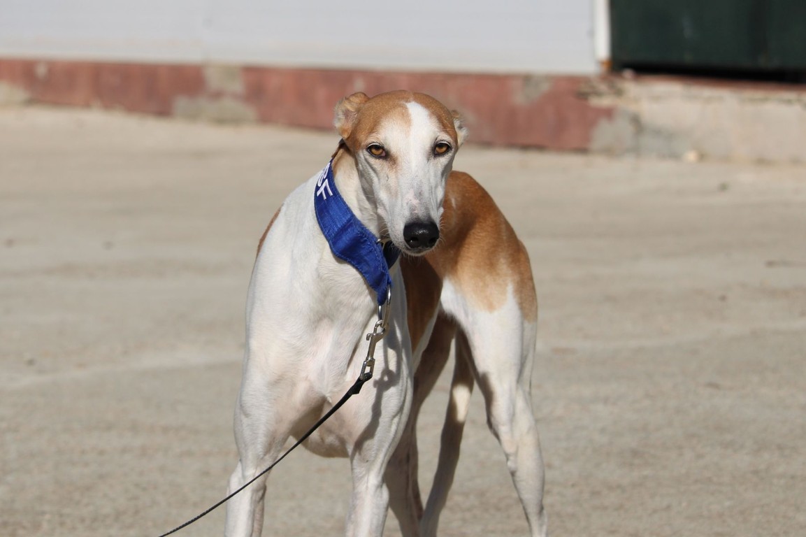 Magnifique galga blanche aux taches rousses, Enola est un véritable bijou.