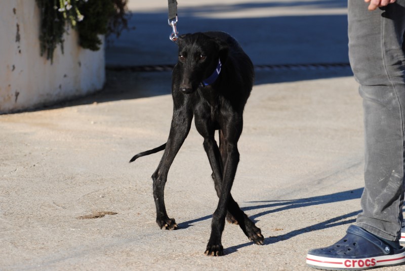 Elle est d’une grande beauté, sa robe noir ébène lui donne un charme particulier et on ne peut qu’être touché par cette toute jeune galga qui ne demande qu’à s’ouvrir au monde.