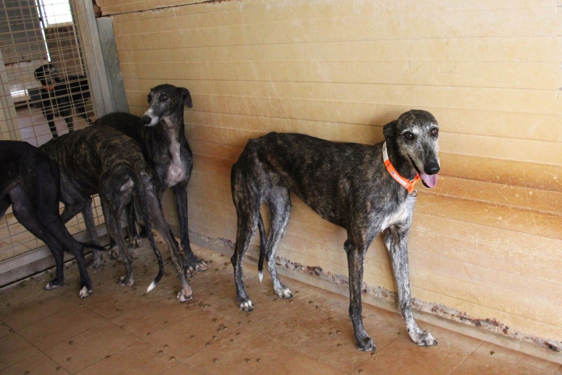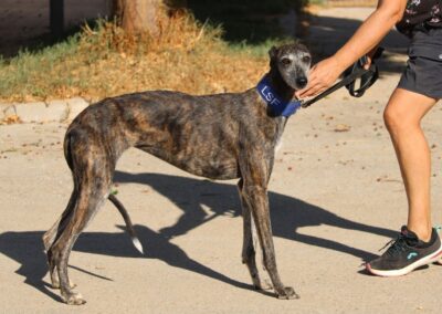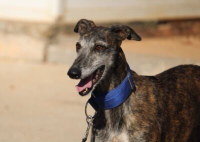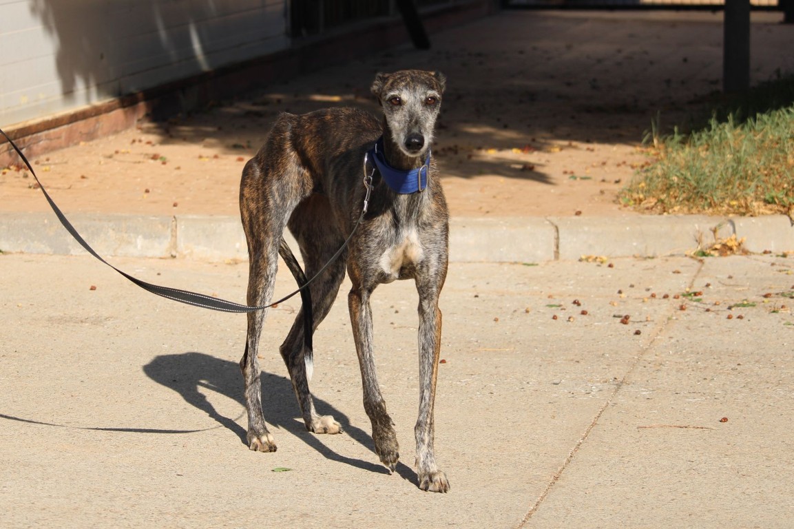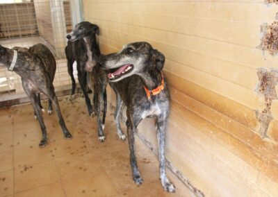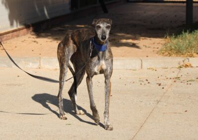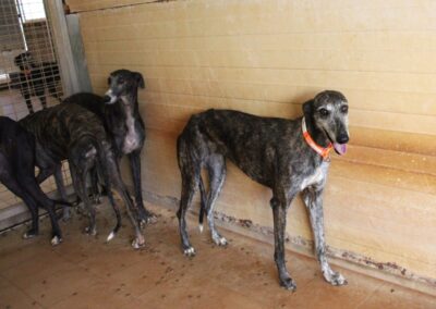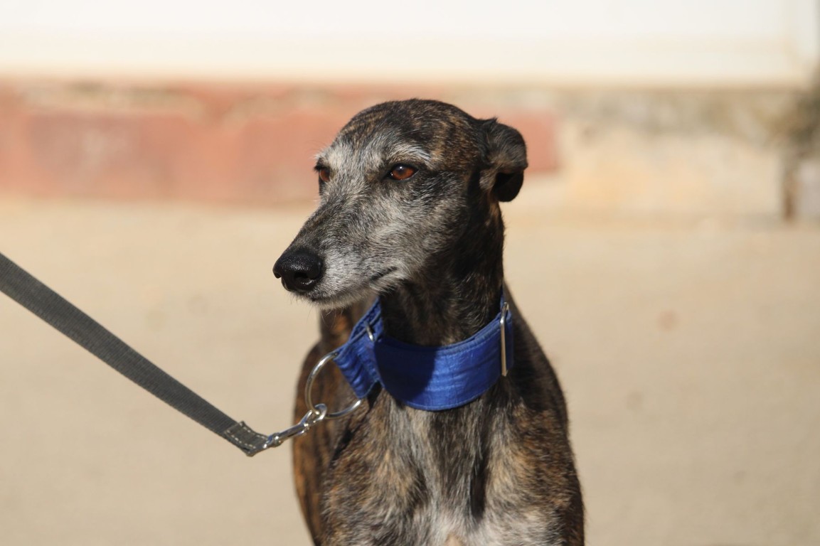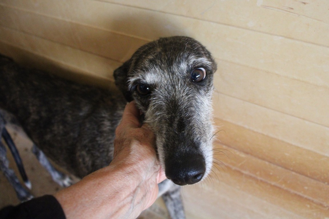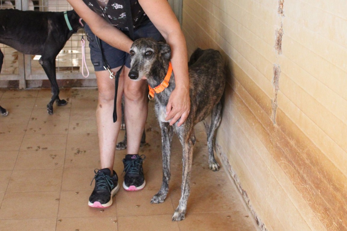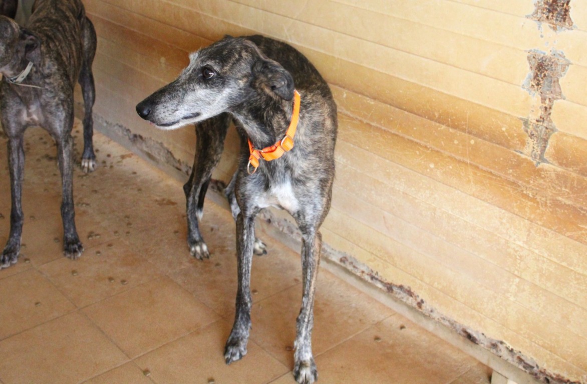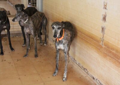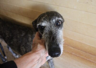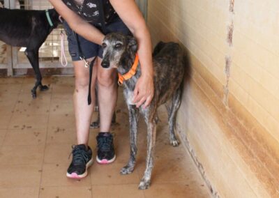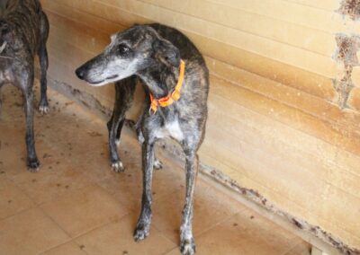 Kity a été abandonnée au refuge de la FBM par un galguero (chasseur), qui l’a jugée « insuffisamment performante » pour poursuivre la saison de chasse. En Espagne, c’est malheureusement le sort réservé à de nombreux galgos : réformés avant, pendant ou après la saison, s’ils ne sont pas jugés assez rentables… Les refuges doivent alors faire face à un afflux massif de chiens.