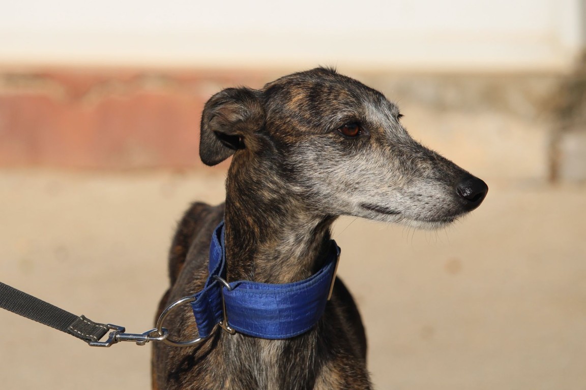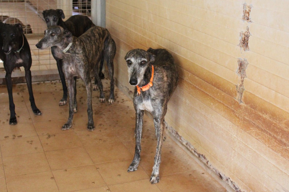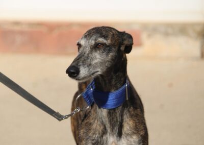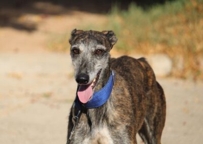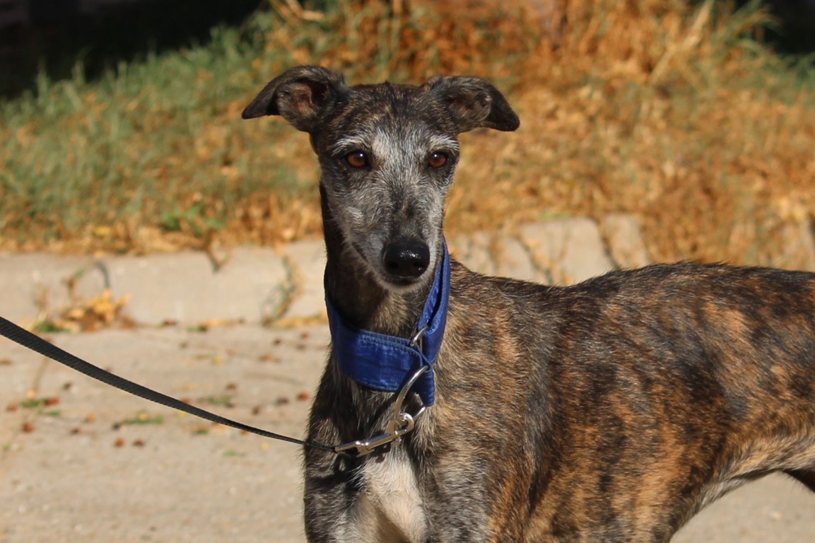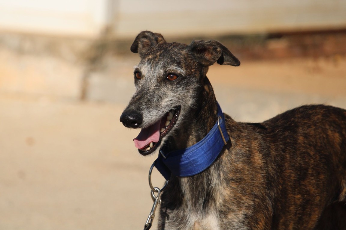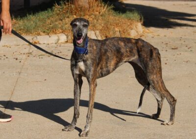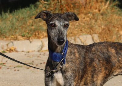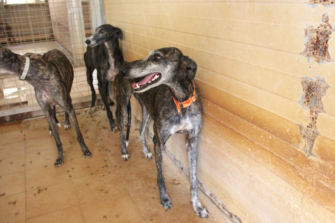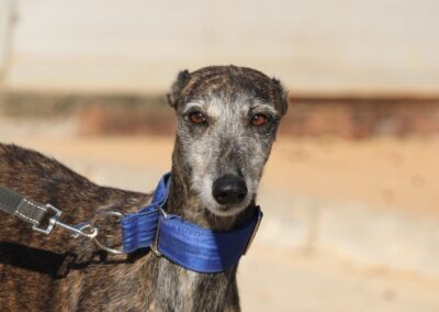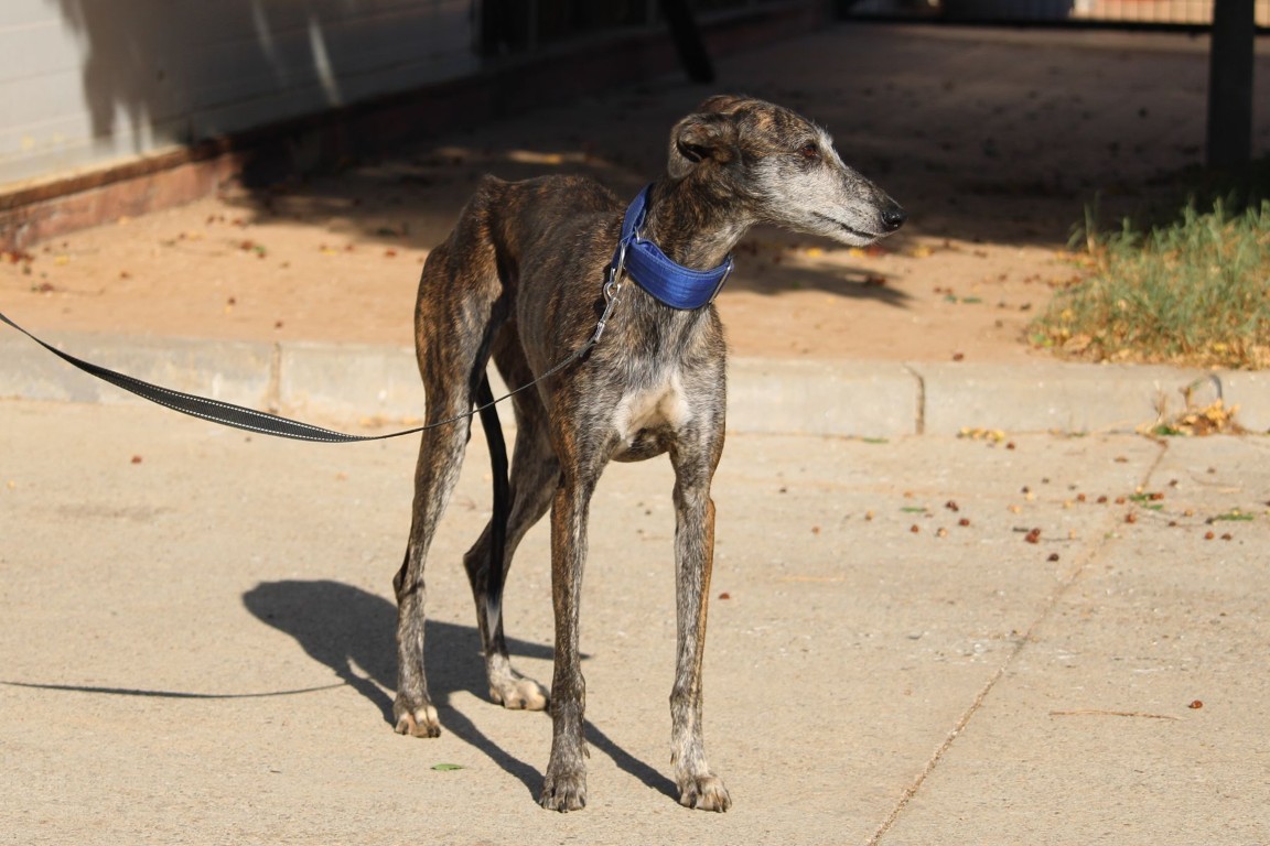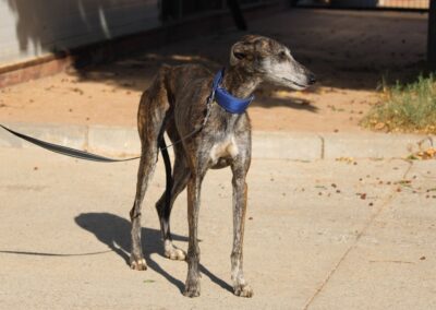 Kity a été abandonnée au refuge de la FBM par un galguero (chasseur), qui l’a jugée « insuffisamment performante » pour poursuivre la saison de chasse. En Espagne, c’est malheureusement le sort réservé à de nombreux galgos : réformés avant, pendant ou après la saison, s’ils ne sont pas jugés assez rentables… Les refuges doivent alors faire face à un afflux massif de chiens.