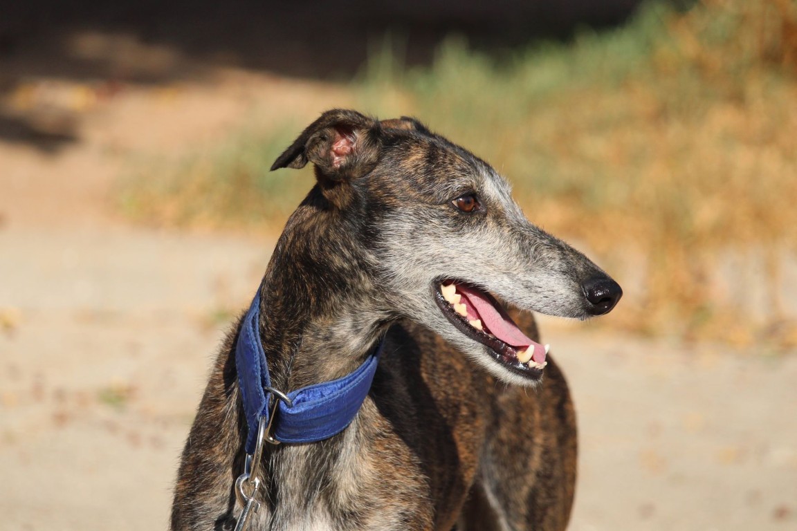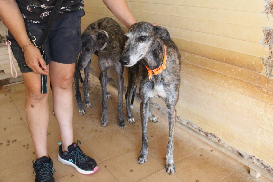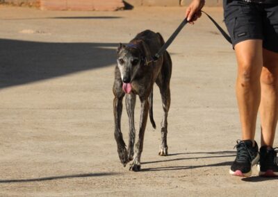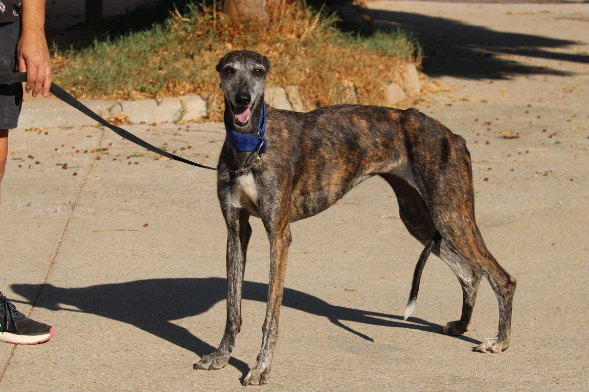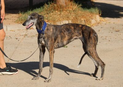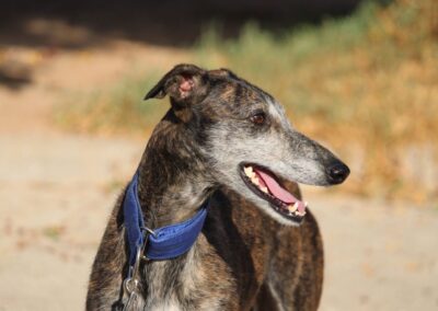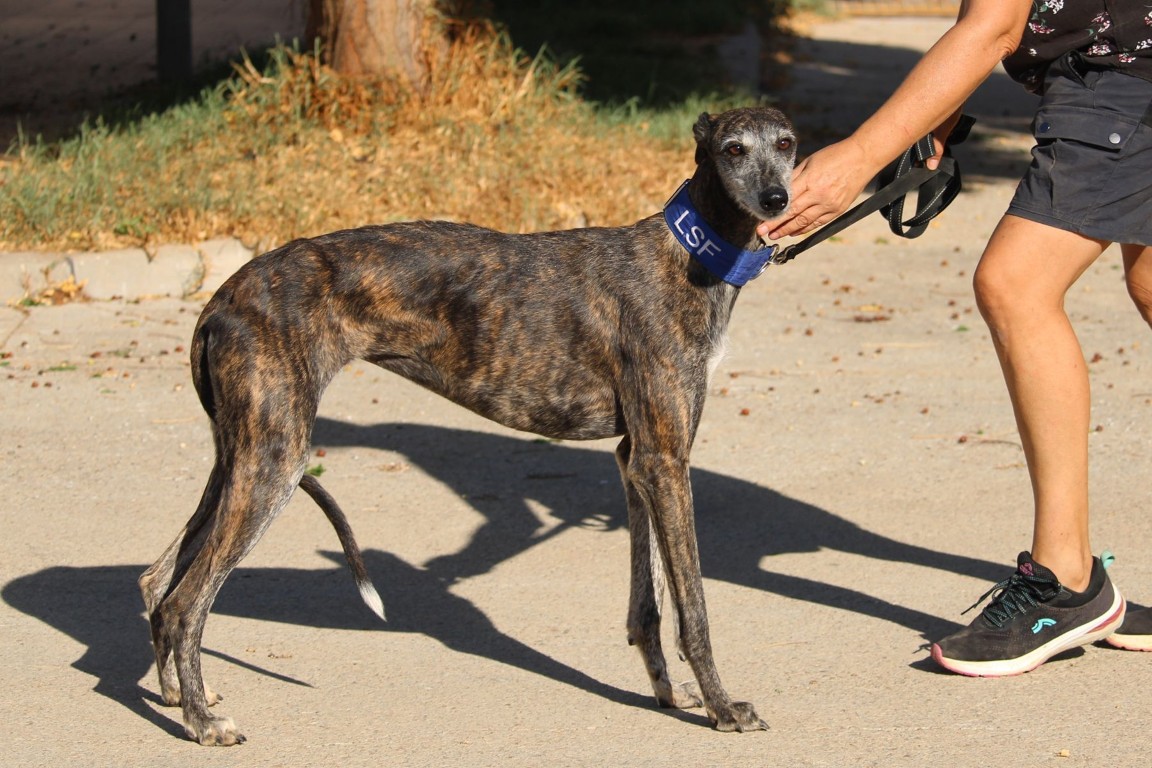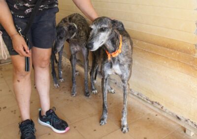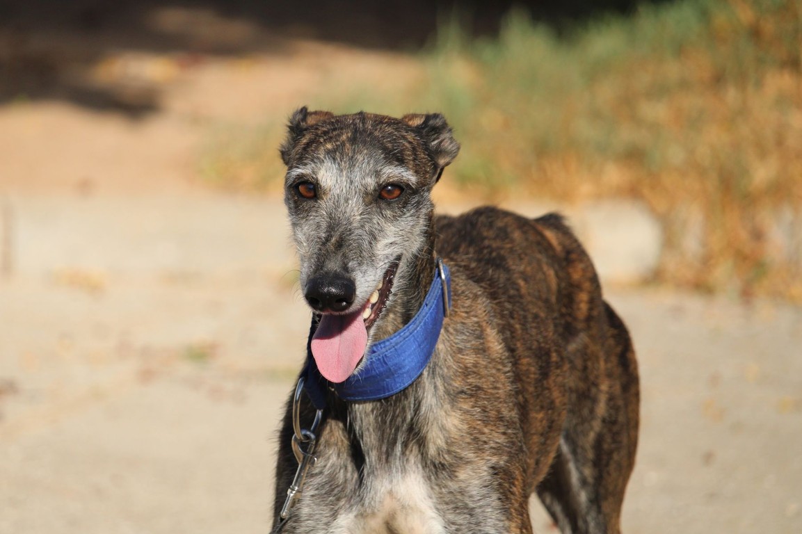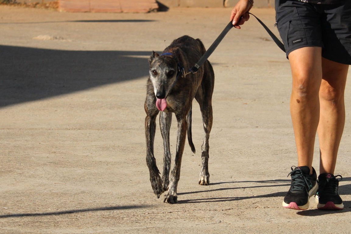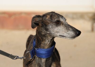 Kity a été abandonnée au refuge de la FBM par un galguero (chasseur), qui l’a jugée « insuffisamment performante » pour poursuivre la saison de chasse. En Espagne, c’est malheureusement le sort réservé à de nombreux galgos : réformés avant, pendant ou après la saison, s’ils ne sont pas jugés assez rentables… Les refuges doivent alors faire face à un afflux massif de chiens.