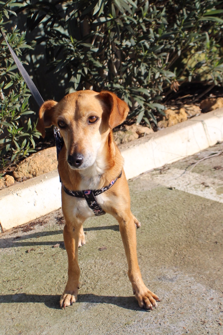 C’est notre bénévole Maité qui a trouvé Lua sur le parking du magasin ou elle faire ses courses. La pauvrette était terrorisée et ne savait pas si elle devait se laisser attraper ou s’enfuir. Mais Maité a toujours des saucisses coupées en rondelles dans sa poche et Lua n’a pas pu résister à la tentation tant elle était affamée. C’est une Podenca adorable qui est sociable et très proche de l’humain. Elle adore les câlins et a un charme fou. Si vous désirez l’adopter , n’hésitez pas à remplir notre formulaire de demande d’adoption .