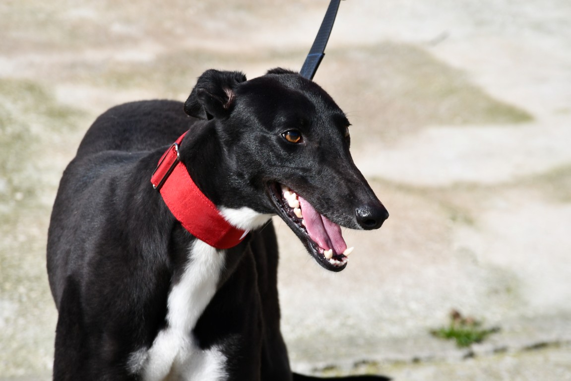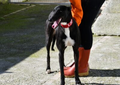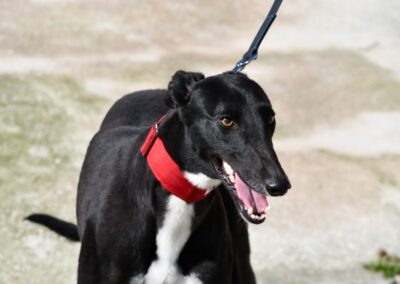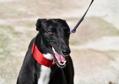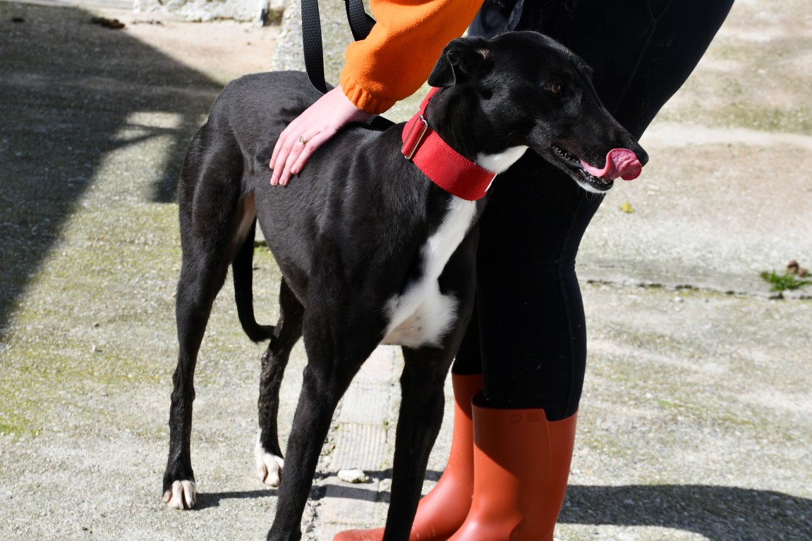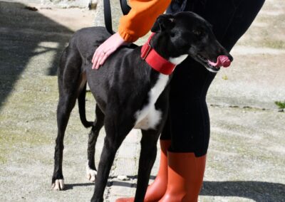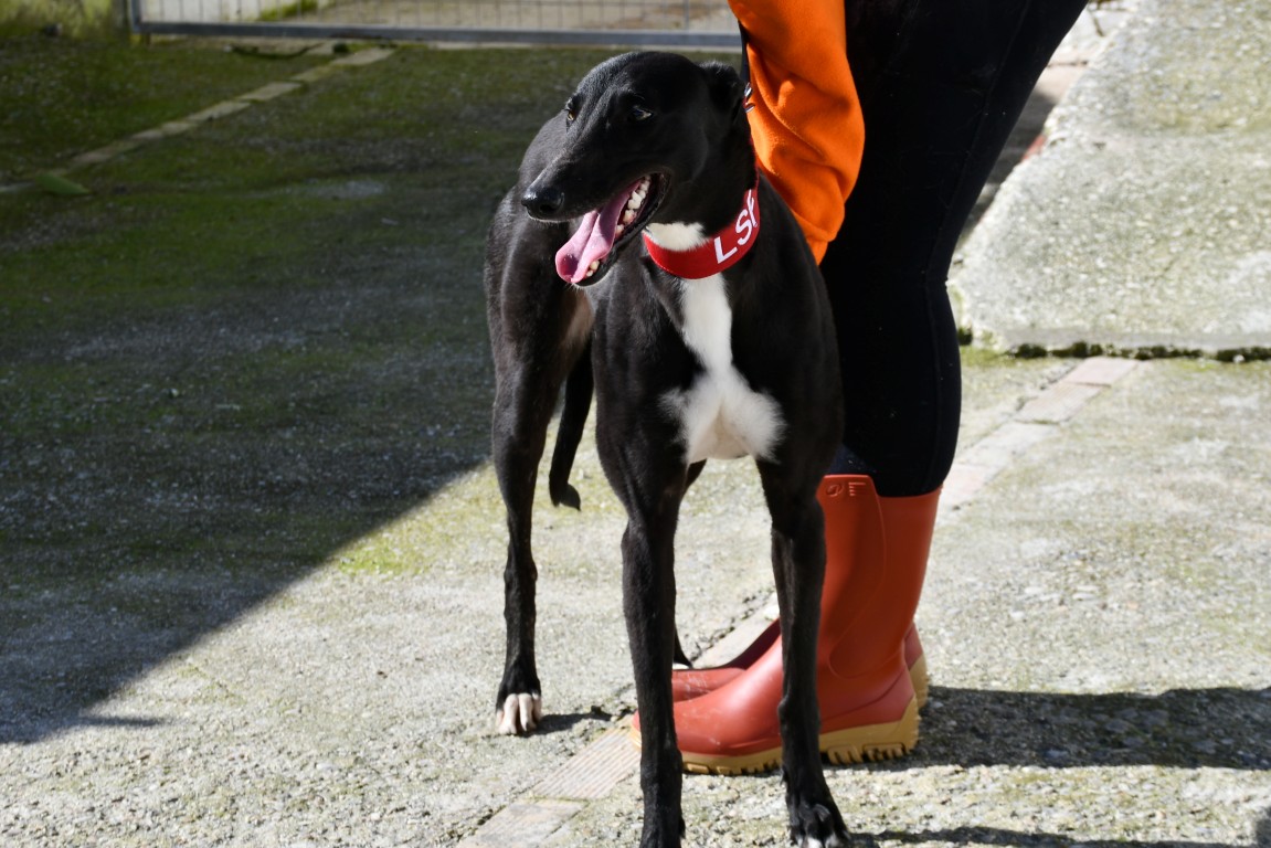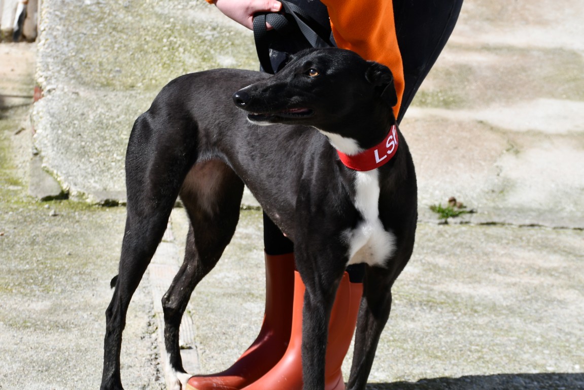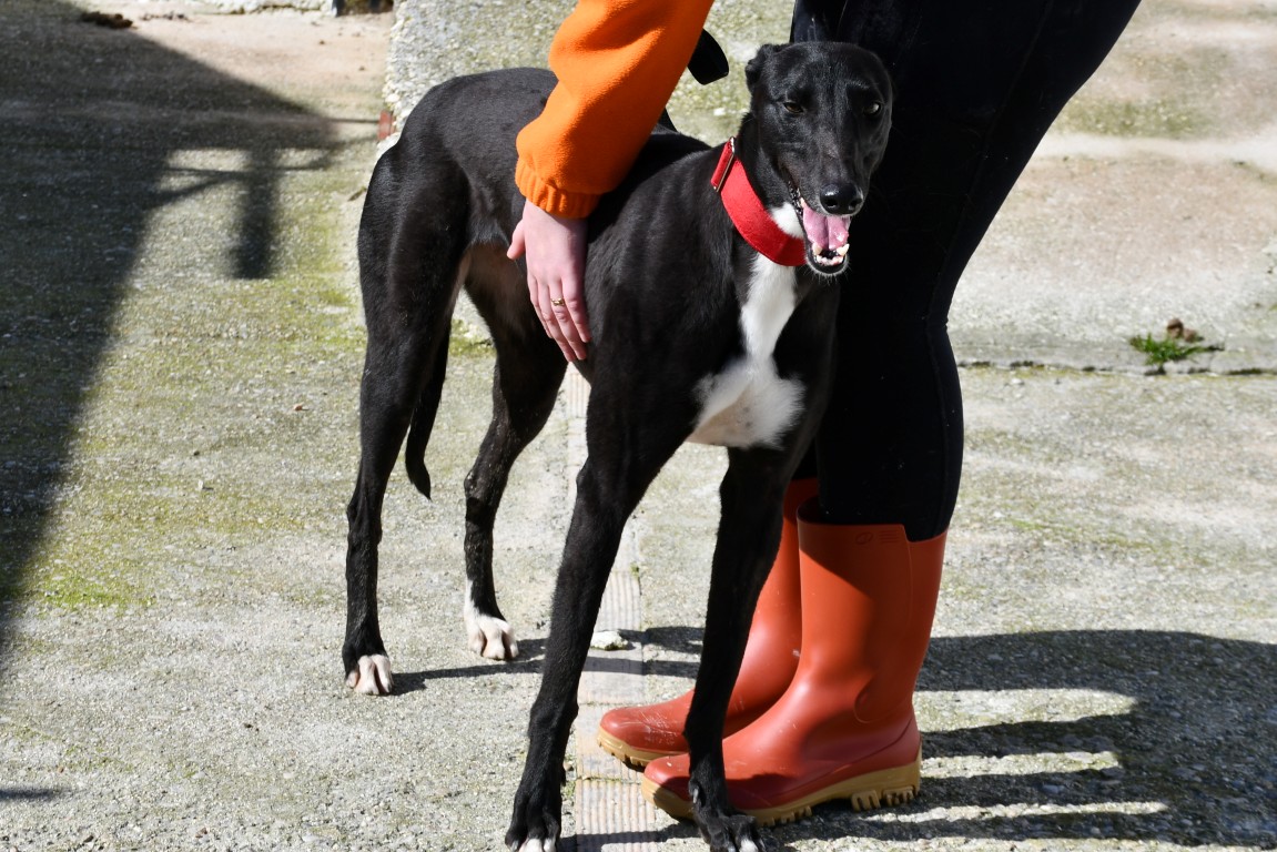Une magnifique galga à la robe noire ébène, sublimée par un élégant plastron blanc ✨