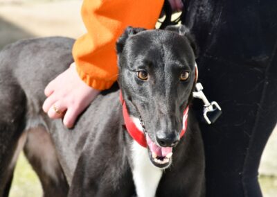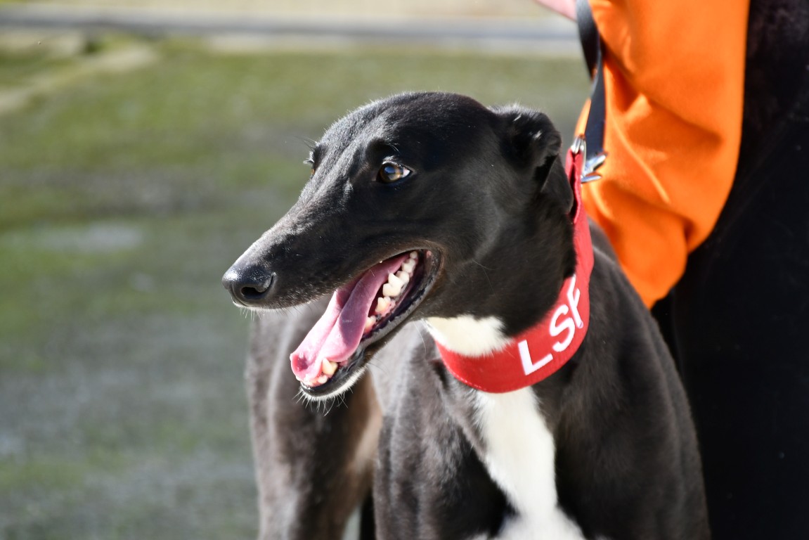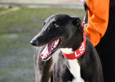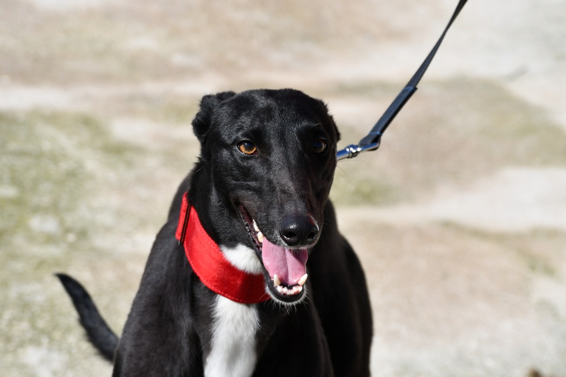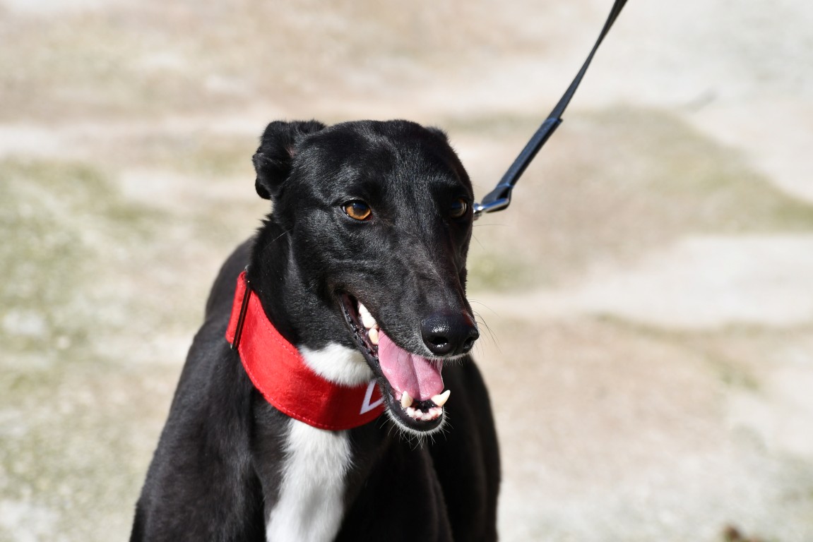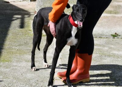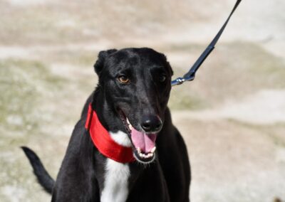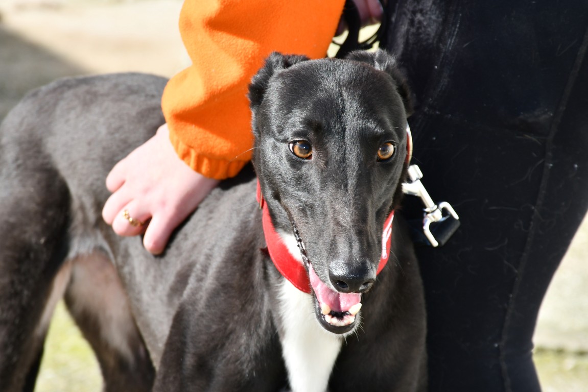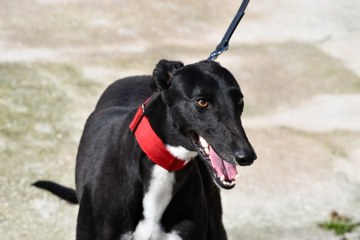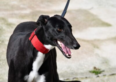 Une magnifique galga à la robe noire ébène, sublimée par un élégant plastron blanc ✨